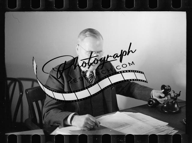 Men,offices,desks,smoking pipes,phones,portrait photograph,1935