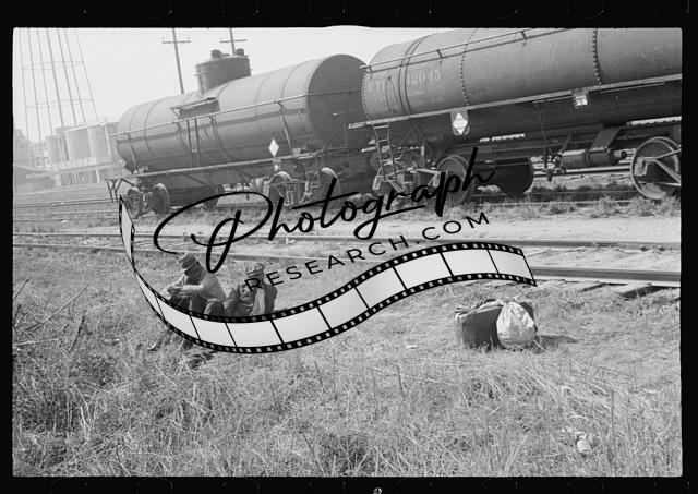 Men seated next to railroad tracks,Train,Farm Security Administration,FSA,2