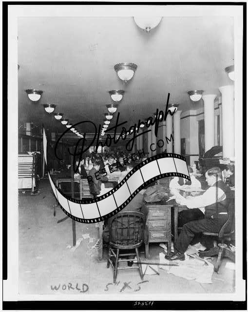 Men working in the newsroom of The New York World newspaper,NY,1930-1950,lights