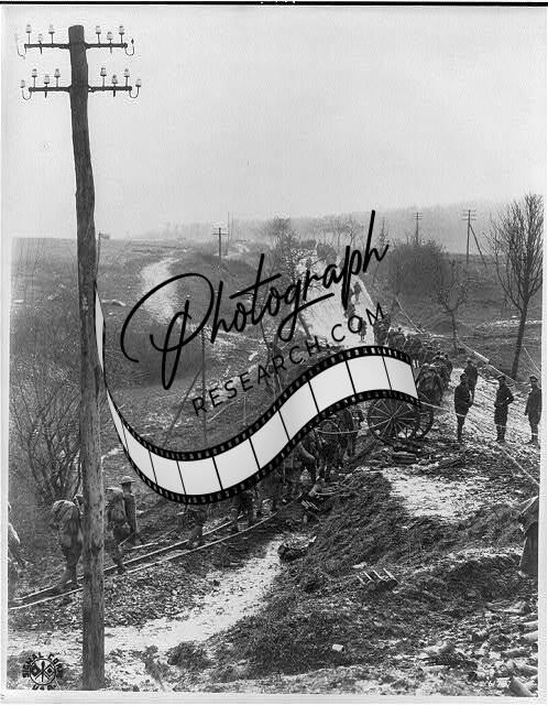 U.S. Army in France: Line of soldiers on muddy road,1918-1919,WWI,World War I