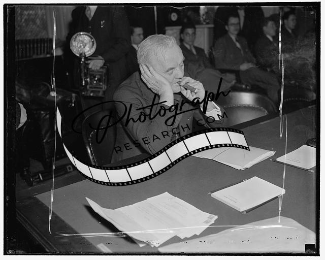Title: Communists filtering into Merchant Marine Union head charges. Washington, D.C., Feb. 9. Appearing before the Senate Commerce Committee today, Joseph P. Ryan, (center) President of the International Longshoremen's Association, an A.F. of L. affiliate, charged 'Communism' to CIO Labor Leaders and incompetence to Government Labor Officials. Ryan is shown with Senator Arthur Vandenberg, (left) and Senator Royal Copeland, Chairman of the Senate Commerce Committee, 2/9/38