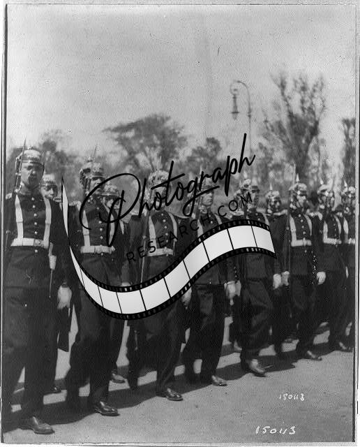 Palace guard marching with spiked helmets,bayonets,Mexico City,Febuary 1913
