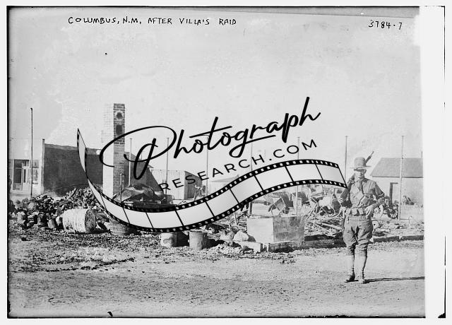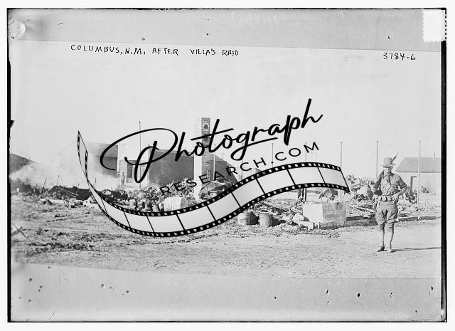 Columbus,N.M. after Villa's raid,New Mexico,smoke,damage,man with rifle,Bain