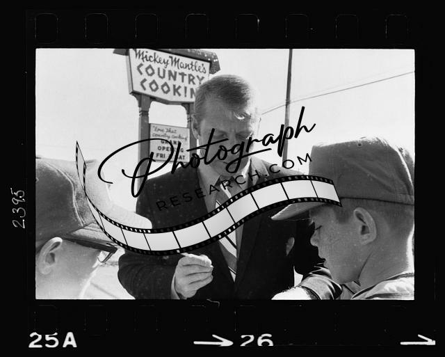 Mickey Mantle signing autographs for young boys in the parking lot of his Dallas, Texas, restaurant