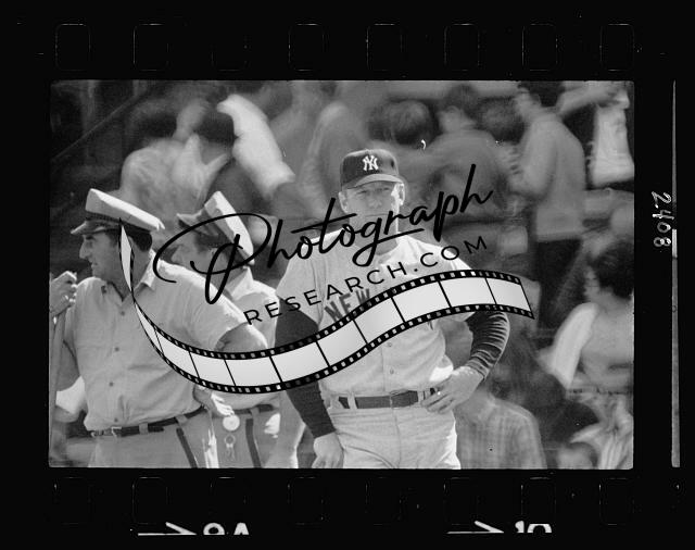 Mickey Mantle, New York Yankee baseball player, in uniform, during game
