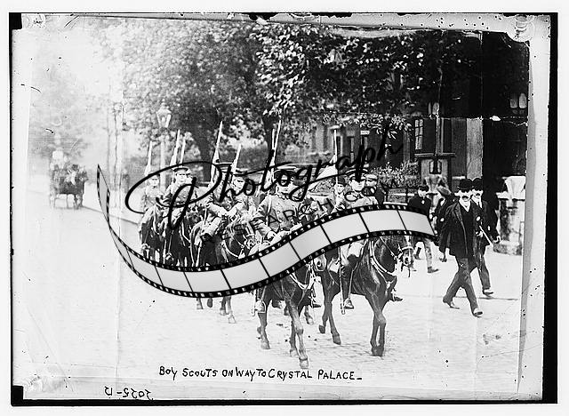 Boy Scouts on way to Crystal Palace; Marching,on horseback,in formation,Children