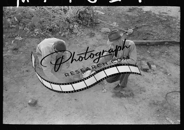 Migrant father,son cooking meal over campfire,Edinburg,Texas,TX,FSA,1939