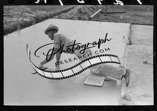 Title: Workman checking measurements at migrant camp under construction at Sinton, Texas