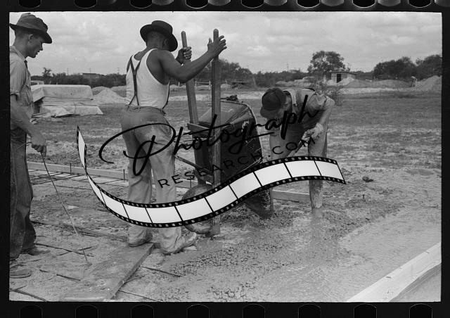 Title: Smoothing concrete floor at migrant camp under construction at Sinton, Texas