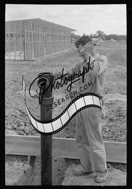 Title: Soldering a joint of cast iron sewer pipe at migrant camp under construction at Sinton, Texas