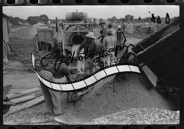 Title: Dumping materials into concrete mixer at migrant camp under construction at Sinton, Texas