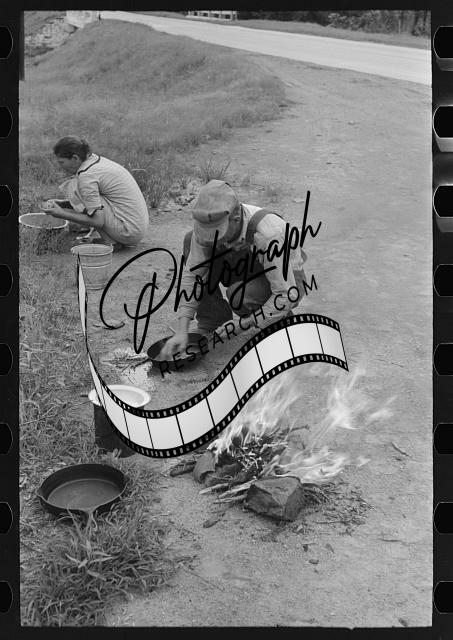 Title: Elmer Thomas putting lard into the frying pan. At roadside camps each person in a migrant camp has his own duties. In this case, Mr. Thomas is attending the fire. There are a certain number of assignments which have been given him, of which this is one. Near Henrietta [i.e., Henryetta,] Oklahoma