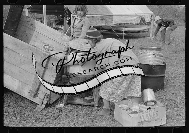 Title: Child of white migrant adding water to boiling beans on stove which was set up immediately after reaching camping grounds near Harlingen, Texas