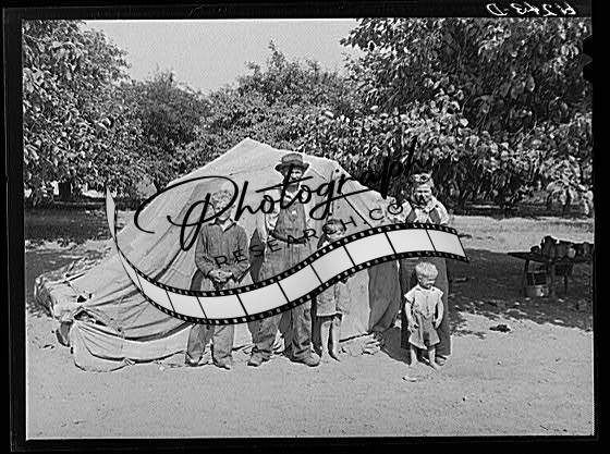 Title: Tent pitched in cherry orchard, occupied by father, mother, and three children from Arkansas. Berrien County, Michigan