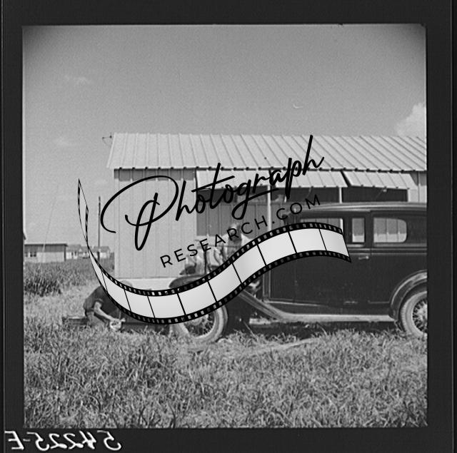 Title: Camp member repairing his car outside his shelter. Osceola migratory labor camp. Belle Glade, Florida