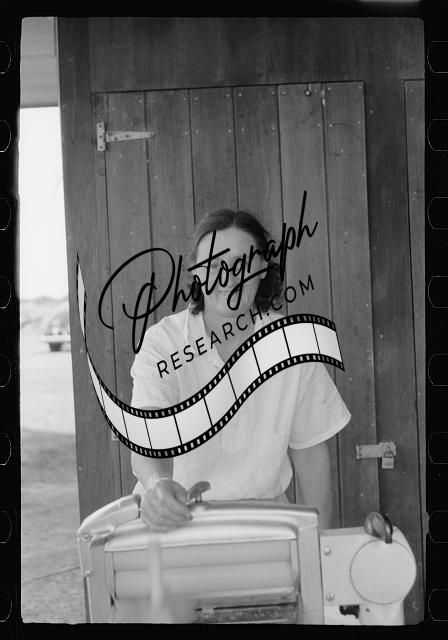 Title: Migratory worker at coop store gas station, FSA (Farm Security Administration) camp, Weslaco, Texas