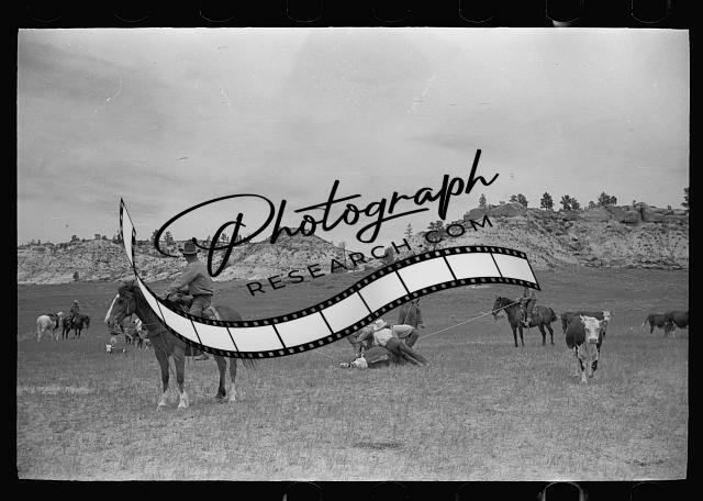 Branding a calf,Quarter Circle U roundup,Montana,MT,June 1939,Rothstein,FSA