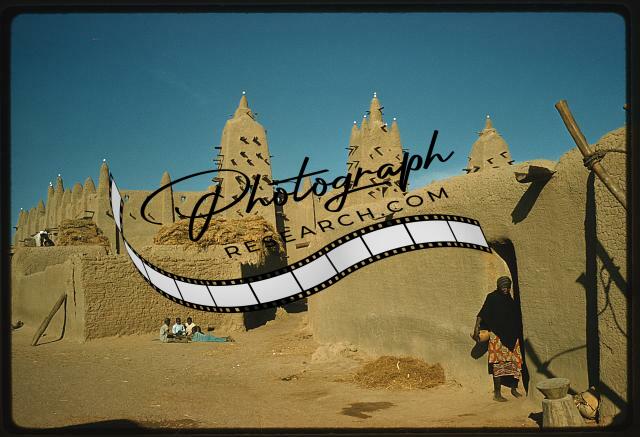 Minarets and upper walls of a mud mosque in Mali; foreground shows adobe walls, firewood(?),and a thatched roof building on right