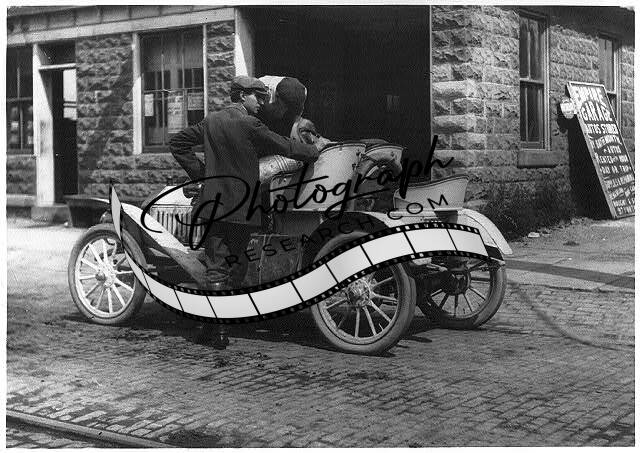 Man putting gasoline in Buick roadster on trip through upstate New York,NY,1909