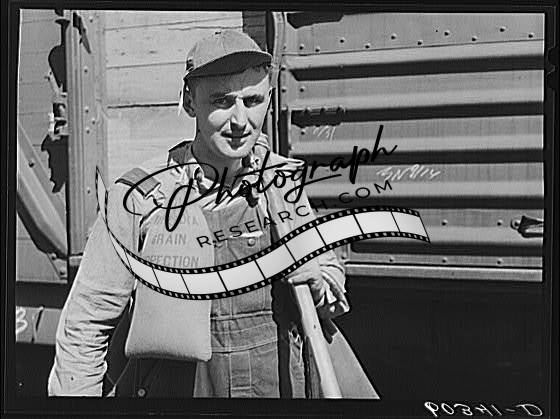 Title: Grain sampler leaving car of wheat after getting samples. Minneapolis, Minnesota