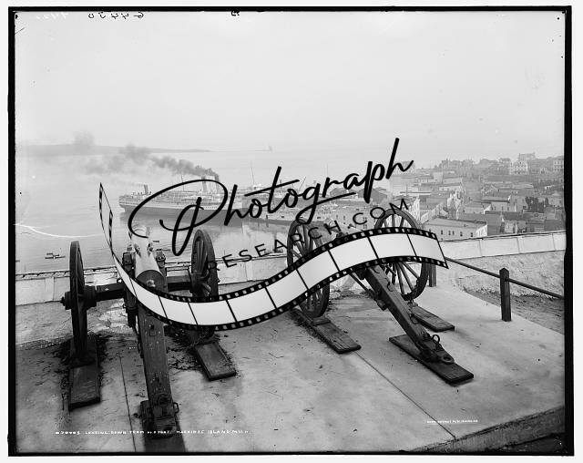 Looking down,old fort,cannons,harbors,boats,Mackinac Island,Michigan,MI,c1908