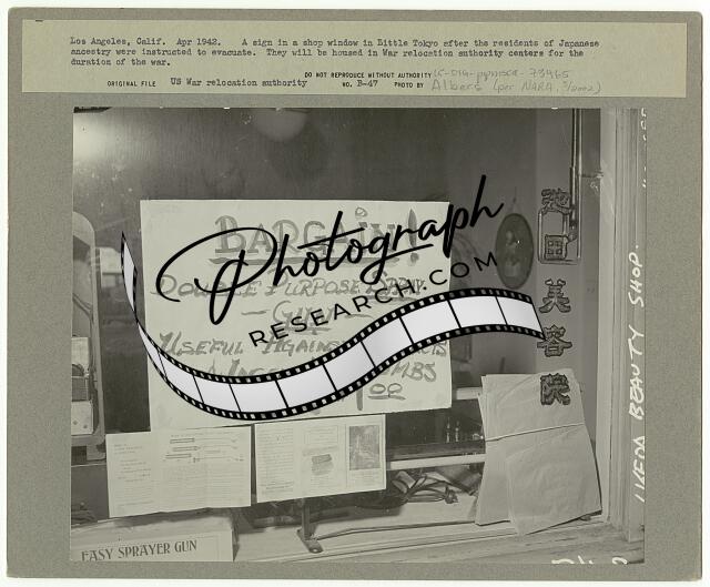 Los Angeles, Calif. Apr. 1942. A sign in a shop window in Little Tokyo after the