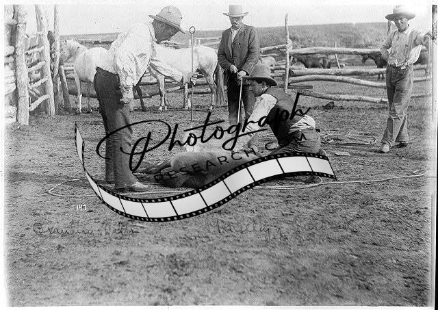 Cowboys branding a colt,c1904,Horse,fence,rope,men wearing hats