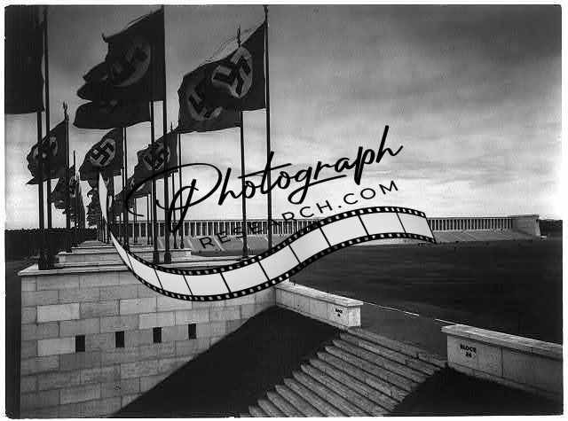 Nazi flags and completed buildings for Reichspareitaggelände (Zeppelinfeld) in Nurnberg