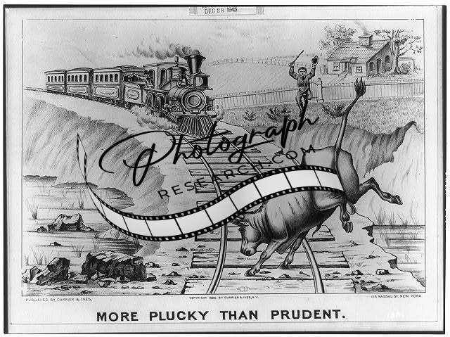 More plucky than prudent,c1885,Currier & Ives,train,cow,RR tracks,man