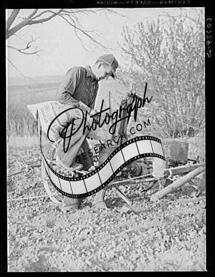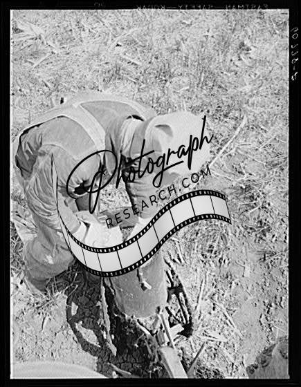 Title: Checking the corn in hills. A cornstalk is placed at every spot where the planter dropped corn to determine whether check row planting is accurate. Monona County, Iowa