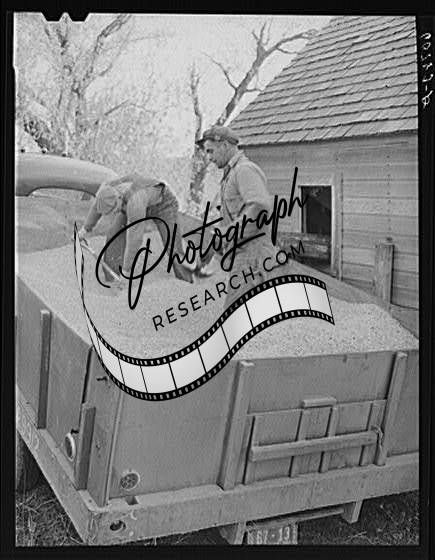 Title: Pouring hybrid seed corn into box on planter. Monona County, Iowa