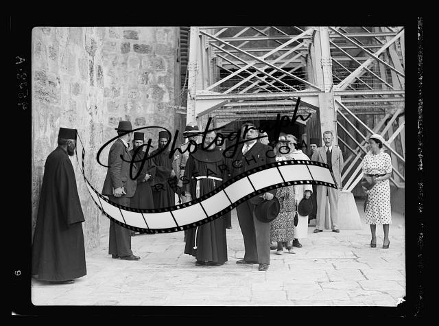 Title: Monsieur & Madame Edouar [i.e., Edouard] Herriot visit to Jerusalem, May 11, 1938. Mr. Herriot & party in front of Ch. [i.e., Church] of Holy Sepulchre showing entrance, Mr. H. seated talking to Fr. Emmanuel Osana