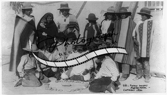 Pueblo Indians playing patol [[Indians wearing blankets watching other Indians pl