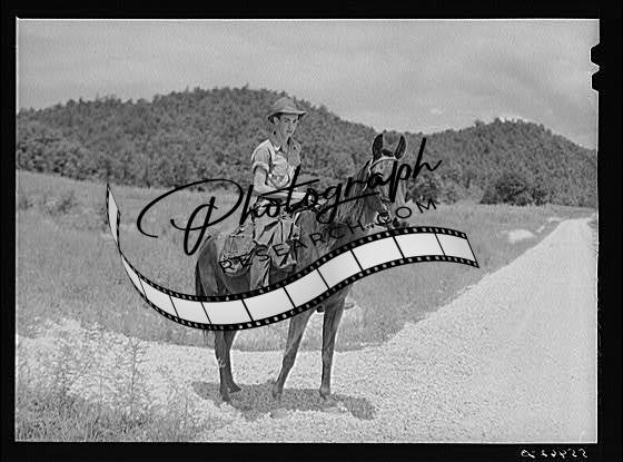 Title: Rural mailman who has brought the mail to the crossroads transfers letters and packages to another postman's saddlebags. This rider takes the mail further up the side road and creek beds where no wagon or car can go. In the mountains section near Morehead, Kentucky