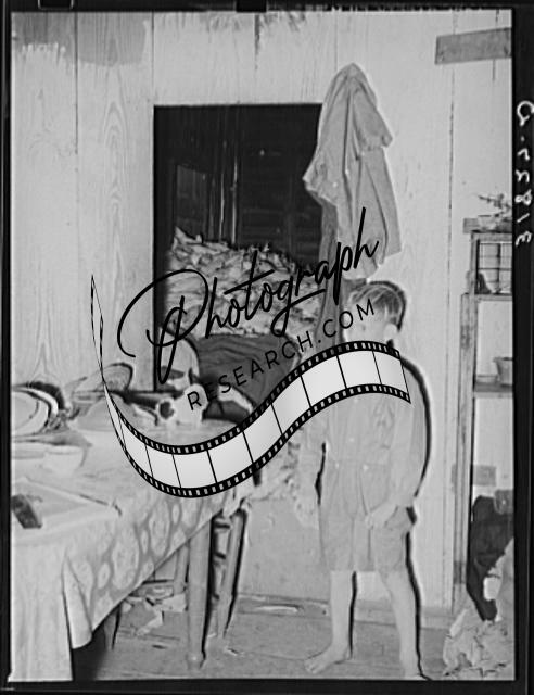 Title: Son of the Adams family, Morganza, Louisiana, in kitchen with corn crib in the rear room