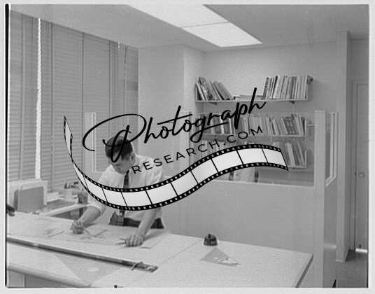 Title: Morris Lapidus, 641 Lexington Ave., New York. Longer shot of drafting room cubicles