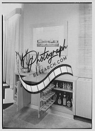 Title: Morris Lapidus, residence at 1059 E. 8th St., Brooklyn, New York. Living room, to bar and card table