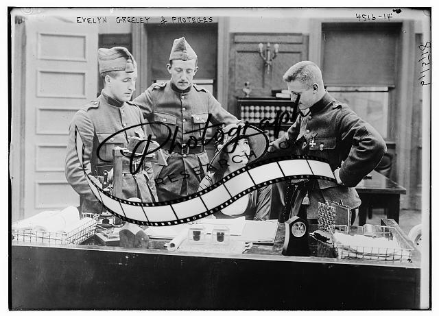 Evelyn Greeley & Proteges,woman surrounded by 3 men,desk,papers,Bain News