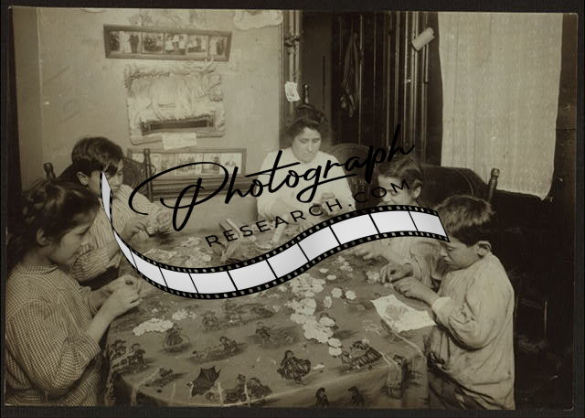 Woman,two boys,two girls sitting at a table,making artificial flowers(?),1922