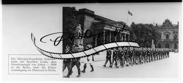 1936 Olympic games - Berlin (GV922-C5, v. 2): Greek team, led by 1896 marathon winner Spyridon Louis, marching down street