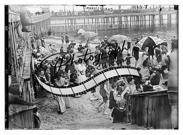 Coney Island,New York,children,umbrellas,bathers,bathing suits,water,sand