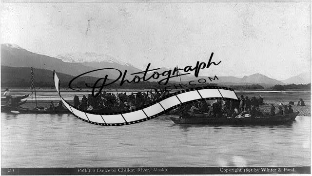 Potlatch dance on Chilkat River,Alaska,AK,c1895,row boats,US flags,people