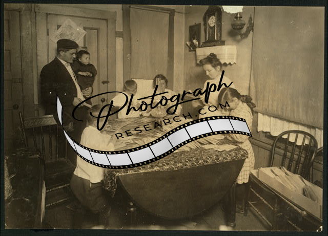 Title: Mrs. Gay, 33 James Street, Attleboro, Mass., and children - 5, 7, 12, and 13 years old, setting stones in cheap jewelry. There were 244 stones in this lot. She said they earned about $5 a week when all worked steadily. (One boy of 10 works, not there when photo was taken.) They work every day except Saturday (house work day) and probably not much Sunday. Work after school and evenings until 8 P.M. or after. The children were home with sore throat, but working industriously. Father works in factory. Photo at 4 P.M. Location: Attleboro, Massachusetts.