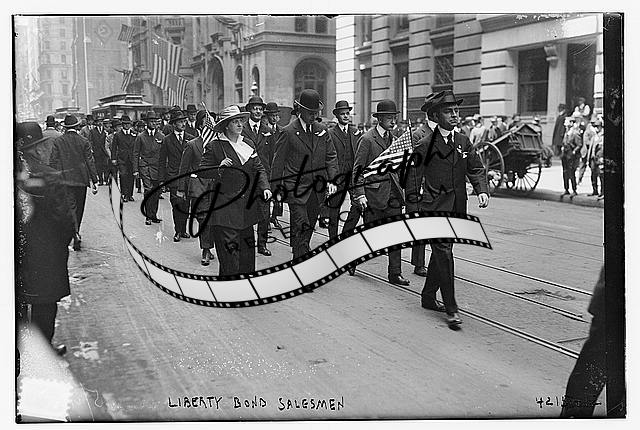 Liberty Bond salesman,American flags,crowded street,Wall Street,Bain News