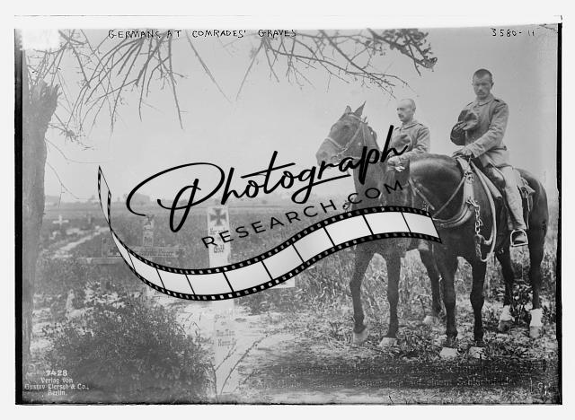 Germans at comrades' graves,men on horseback,crosses,death,Bain News Service