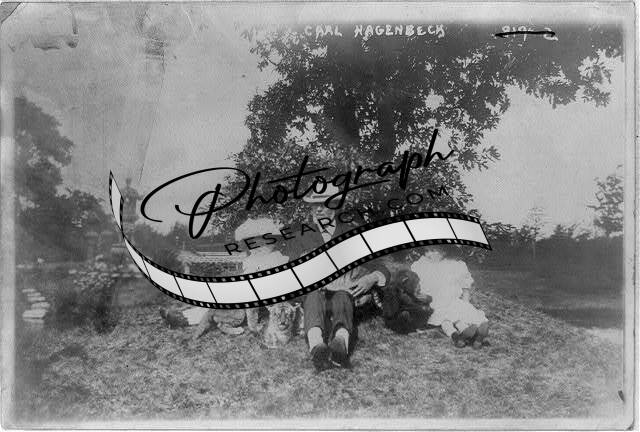 Carl Hagenbeck,1844-1913,seated on ground,2 girls,chimpanzee,3 lion,tiger cubs