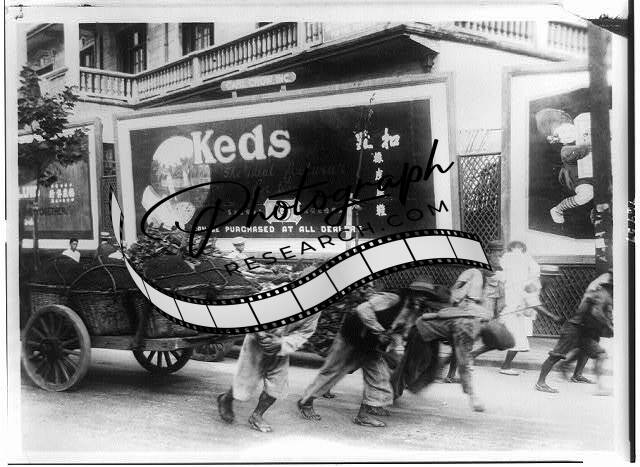 Chinese men pulling cart,city,China,billboard advertisement,Keds shoes,1927