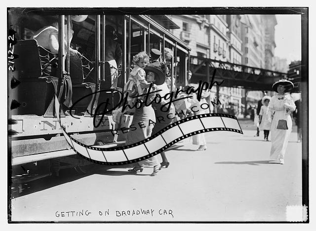Getting on Broadway car,woman holding child,July 11,1913