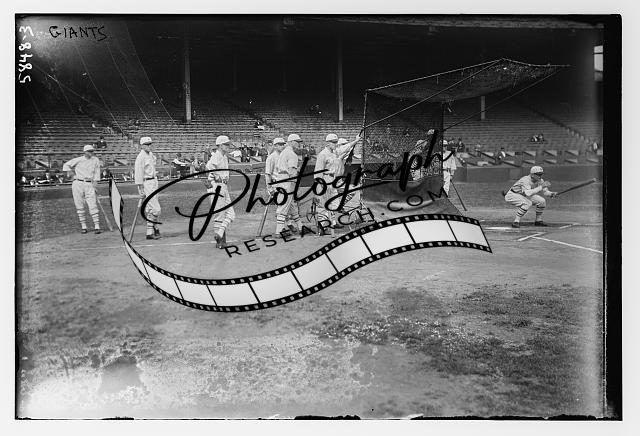 New York Giants players around batting cage,baseball players,fields,bats,uniform