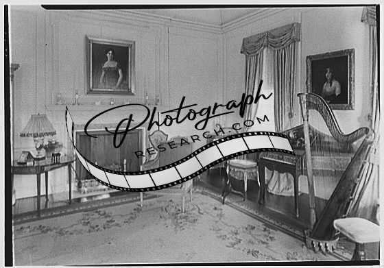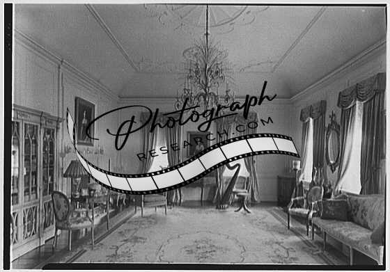 Title: Mrs. Washington A. Roebling, residence at 64 S. Battery, Charleston, South Carolina. Drawing room fireplace, harp foreground